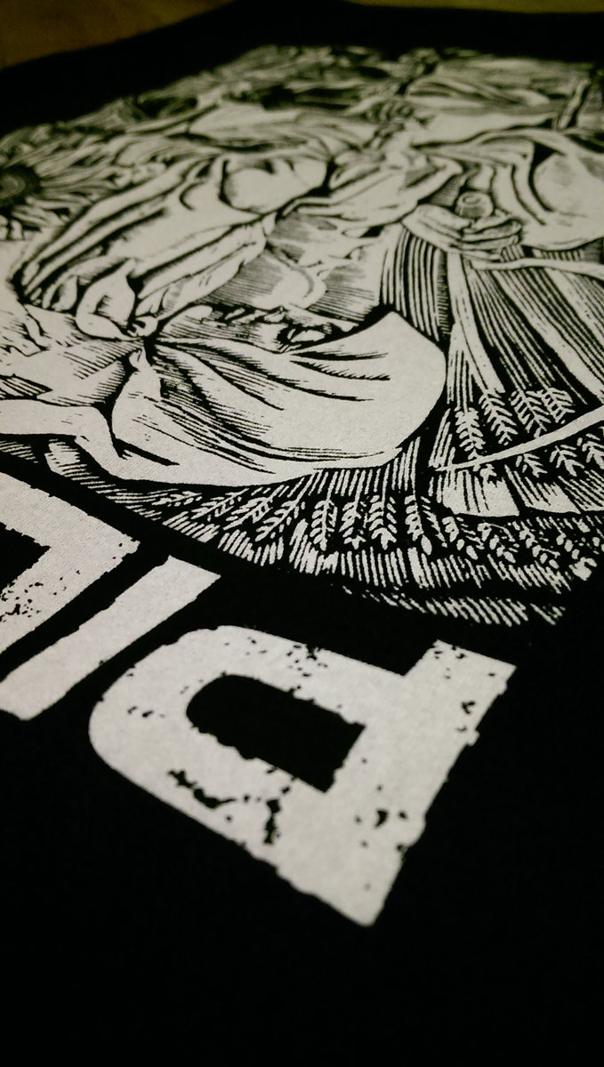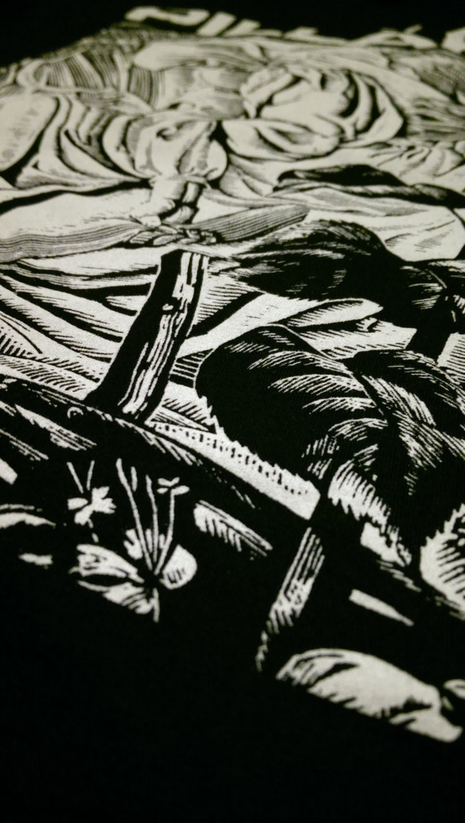 Block-print image, printed on black 100% ringspun cotton t-shirts using discharge ink, for an image that won't fade, crack, peel, or feel like a giant sticker.